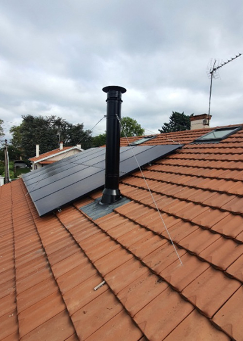 - Création d’un conduit isolé : Un conduit isolé de diamètre 180 mm a été installé pour garantir la sécurité et l’évacuation optimale des fumées. Un haubanage a également été mis en place pour renforcer la stabilité.