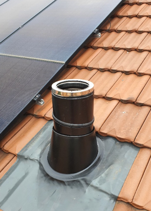 Démolition de la cheminée à foyer ouvert, création de l’arrivée d’air frais, tubage en sortie de toit, haubanage du conduit d’évacuation